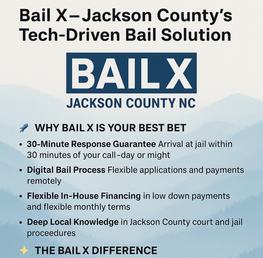 Jackson County is home to Western Carolina University and a proud mountain culture rooted in resilience and compassion. Whether you’re in Sylva, Cullowhee, or Cashiers, bail emergencies hit each of us. BAIL X embodies that spirit—serving with heart, speed, and respect.